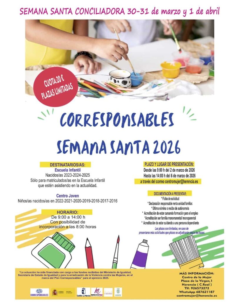 The City Council of Herencia, through the Women’s Center, has launched the 5th Edition of the Conciliatory Holy Week. This initiative, part of the Corresponsables Plan, aims to facilitate childcare for minors during the Holy Week vacation period and support the reconciliation of work and family life in the municipality.