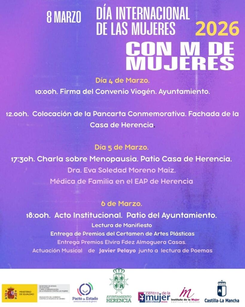 Herencia will once again celebrate the International Women’s Day with a program of activities taking place during the first days of March, extending into the following week with offerings targeted at primary and secondary school students. The agenda, coordinated by the Women’s Center alongside various municipal departments and educational institutions, includes the signing of the VioGén protocol, a health talk on menopause, the institutional event on March 8, and various cultural and educational activities.