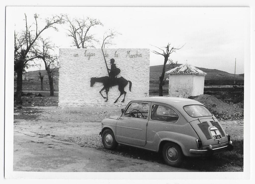 In a photograph that encapsulates the spirit of mid-20th century Spain, a SEAT 600 is parked in front of a promotional mural of “A place in La Mancha” in Herencia (Ciudad Real). This graphic material, dated between 1960 and 1970, reflects not only the rise of tourism and the identity of La Mancha, but also the social and economic transition that the country was experiencing in that decade.