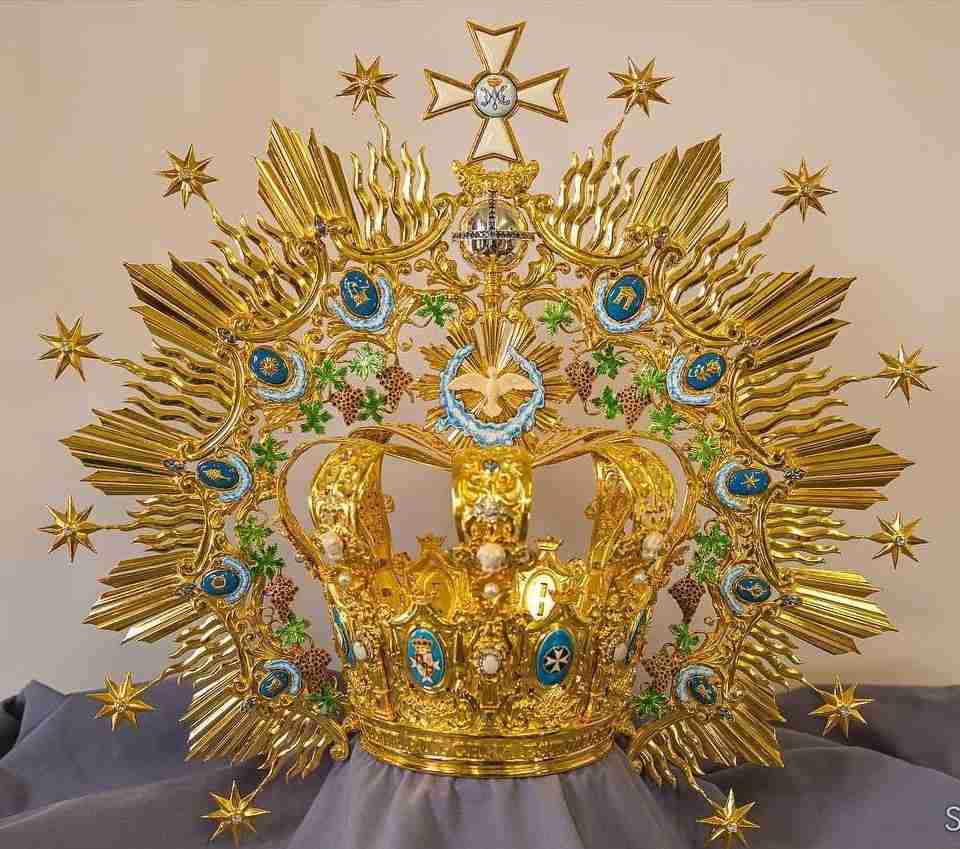 A Crown full of symbols: Marmolejo detailed one by one the symbolism of all the elements that make up the work. In this way, we can appreciate the Cross of St. John, the coat of arms of the municipality, the coat of arms of the Vatican, the diocese and the emblems of the Parish and the Brotherhood. The Crown consists of a basket, imperials, and a halo. It has taken as its central inspiration the grandiose painting that presides over the main altar of the Parish and its frame.