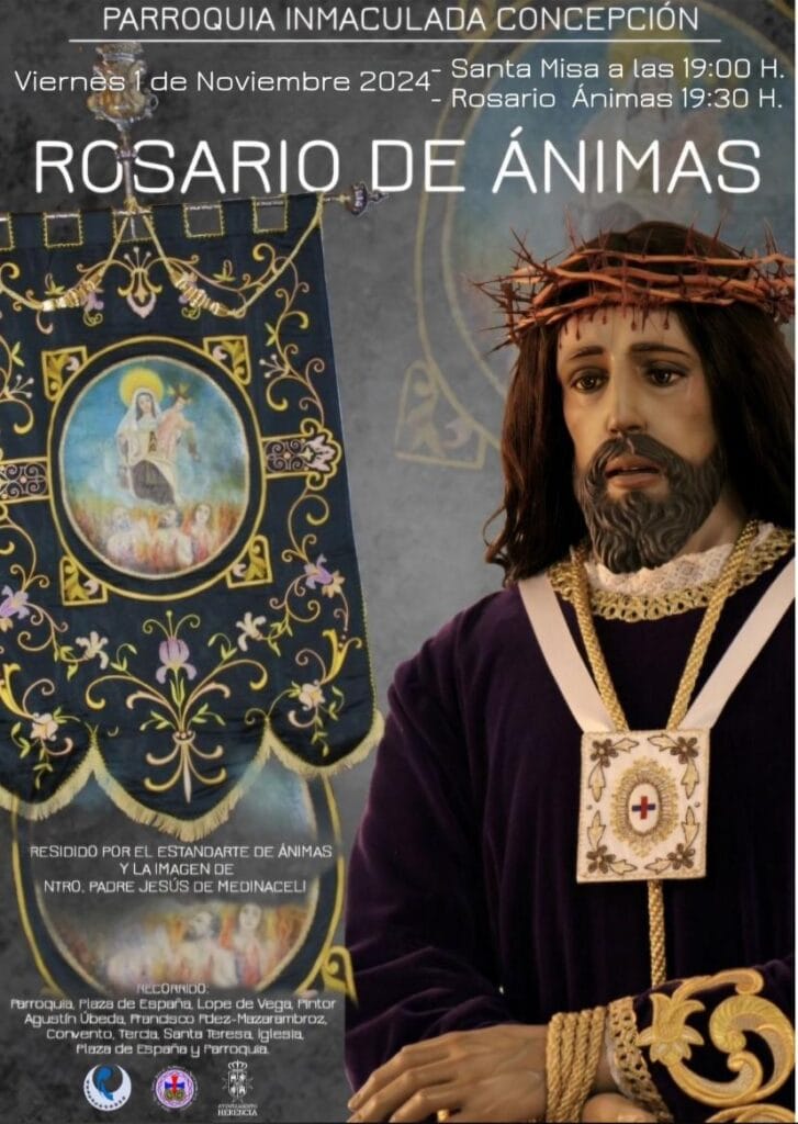 On Friday, November 1, the traditional Rosary of Souls will take place, after the celebration of the solemn function at the parish church of the Inmaculada Concepción which will begin at 7:00 pm. This is a procession during which the rosary will be prayed for the eternal rest of our deceased. This procession will be presided over by the Banner of Souls and this year also by the image of Our Father Jesus of Medinaceli.
